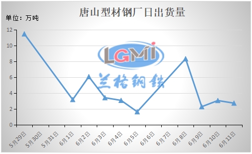 下游型材出货量方面:下图为近两周的唐山型材钢厂日出货量走势图,从图中可以看出,近两周型材出货量在逐次递减,从上周11.47万吨,到6月11日的2.71万吨,大降了8.76万吨,降幅为76.4%。