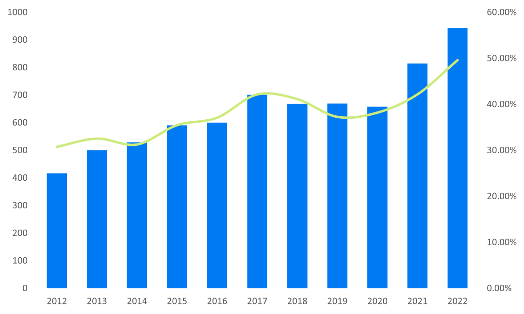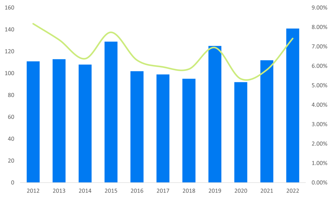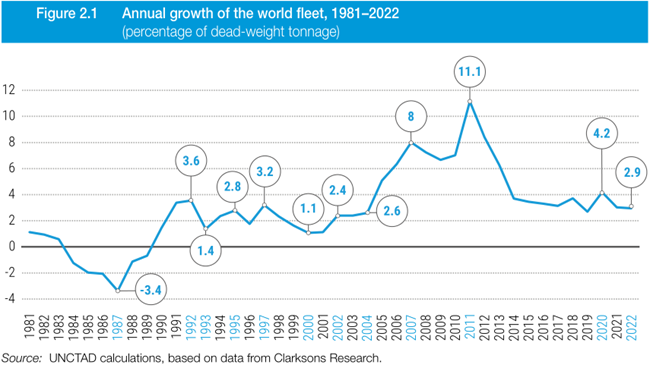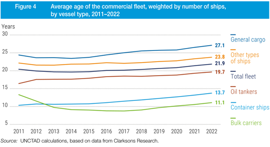 根据联合国UNCTAD《2022年海运回顾》报告,2022年,全球商业船队增长不到3%,是自2005年以来的第二低增长率。全球船队的低增长率反映到船舶营运层面就是船舶的老龄化,自2011年以来,全球船队的平均船龄增加了7%,从20.4年增加到21.9年,且呈持续老化趋势,这可能使得船舶遵守日益严格的环境法规变得更加困难。