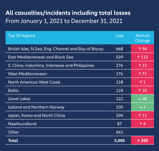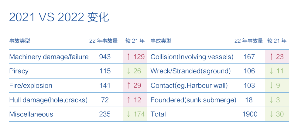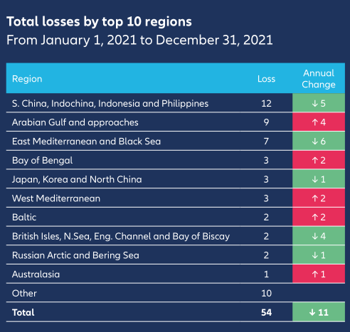 2022年5月,安联保险集团(AGCS)发布的《2022 年度安全与航运报告》分析了超过100总吨以上船舶的损失和伤亡(事件)。2021年,全球报告了54艘船舶全损事故,与2020年相比减少11艘(下降17%),近10年船舶全损数量下降了57%(2012年为127艘),相比90年代初全球船舶每年要灭失200多艘,船舶安全出现了显著改善。