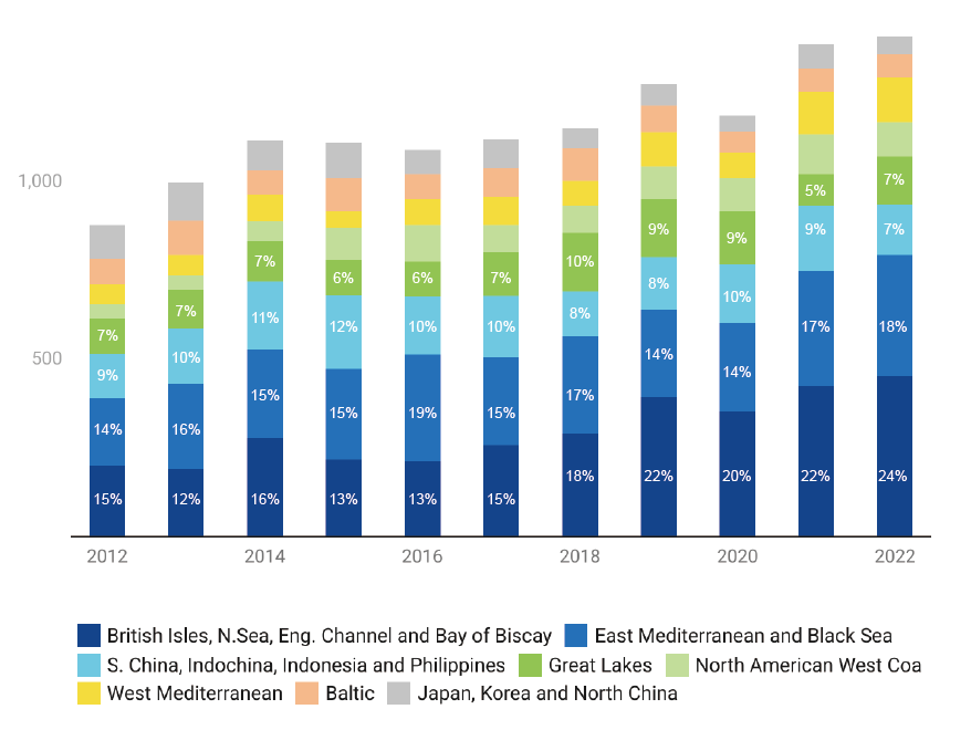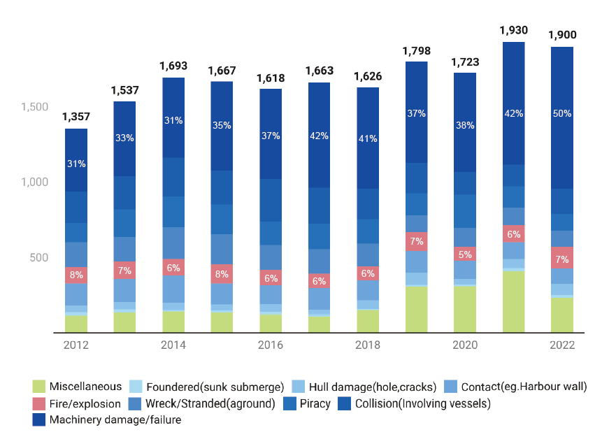 统计显示,机损事故一直呈上升趋势,尤其是近两年来机损事故出现事故量、事故比重双升的趋势。随着 2023年1月1日碳强度评级生效实施,可能使得船舶机损事故变得越来越复杂,且不确定性增加。同时,随着船舶大型化、货物申报相关风险以及电动汽车运输的兴起,船舶火灾风险越来越受到关注。2022年一季度,航运业发生了包括客滚船、汽车船和油轮在内3艘 3000总吨以上的船舶因为船舶火灾事故导致的船舶全损事故。