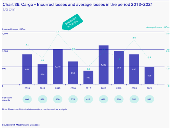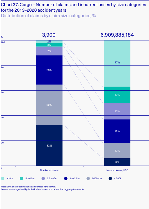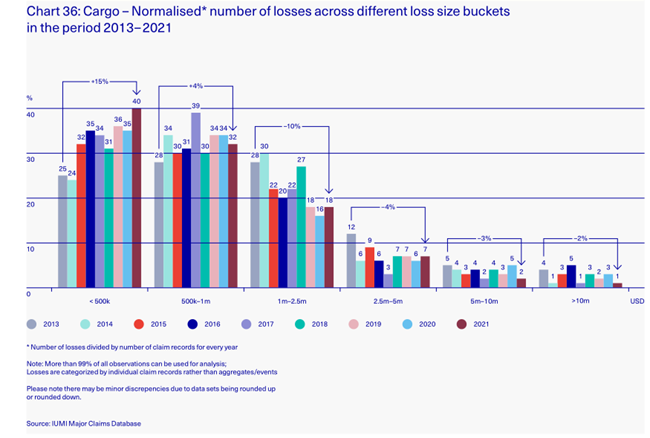 2022年9月,国际航运联合会(IUMI)发布的海上保险市场分析报告显示,较小的损失在增加,而较大的损失在减少,统计显示32%的货损索赔低于50万美元,占货损索赔总额的6%。