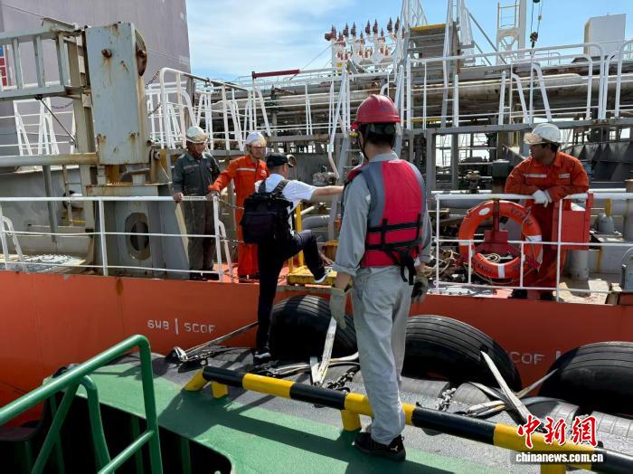来自嘉兴港的引航员登上巴拿马籍散装化学品船“RABIGHSUNSHINE”轮。浙江海事局供图