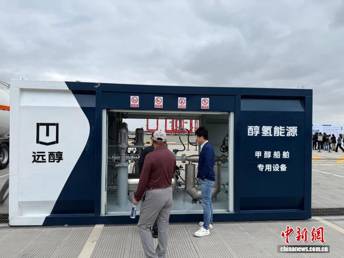 20日,全球首艘甲醇电动集散两用船“远醇001”号首航仪式在上海港罗东集装箱码头举行。图为仪式现场展示的甲醇船舶专用设备。谢梦圆 摄