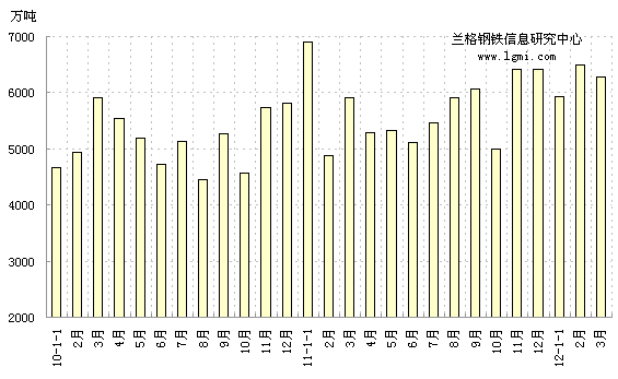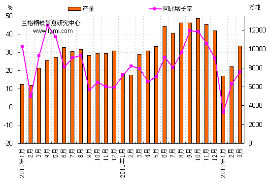 据国家统计局统计,2012年3月份我国原矿产量为1.03亿吨,环比增加2174.5万吨,环比增长26.65%;同比增加1660.8万吨,同比增长19.15%。(详见图12-1)