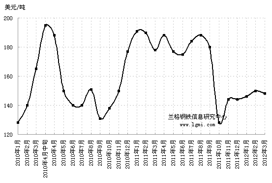 据兰格钢铁信息研究中心市场监测显示,截至4月30日:国内主要港口63.5%印度粉矿市场价格为1040-1060元,跌10-20元;63.5%印度粉矿外盘报价在148-149美元,较月初下跌1-2美元 (详见图12-3)。