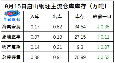 9月15日唐山钢坯库存早报:继昨日唐山钢坯库存总量下降之后,今日早间唐山钢坯库存总量继续下滑;海翼宏润钢坯库存34.54万吨,较昨日降0.35万吨,入库0.17万吨,出库0.52万吨;象屿正丰钢坯库存27.15万吨,较昨日降0.11万吨,入库0.07万吨,出库0.18万吨;物产震翔钢坯库存9.3万吨,较昨日降0.07万吨,入库0.14万吨,出库0.21万吨;三家仓库总库存量为70.99万吨,较上一日降0.53万吨。