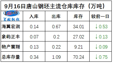 9月16日唐山钢坯库存早报:海翼宏润钢坯库存34.01万吨,较昨日降0.53万吨,入库0.14万吨,出库0.67万吨;象屿正丰钢坯库存27.02万吨,较昨日降0.13万吨,入库0.07万吨,出库0.2万吨;物产震翔钢坯库存9.21万吨,较昨日降0.09万吨,入库0.13万吨,出库0.22万吨;三家仓库总库存量为70.24万吨,较上一日降0.75万吨。