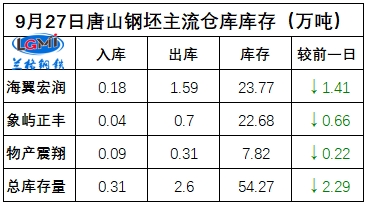 9月27日唐山钢坯库存总量下降2万余吨