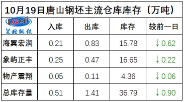 10月19日唐山钢坯库存早报:海翼宏润钢坯库存15.78万吨,较昨日降0.62万吨,入库0.21万吨,出库0.83万吨;象屿正丰钢坯库存16.65万吨,较昨日降0.22万吨,入库0.25万吨,出库0.47万吨;物产震翔钢坯库存4.36万吨,较昨日降0.06万吨,入库0.05万吨,出库0.11万吨;三家仓库总库存量为36.79万吨,较昨日降0.90万吨。