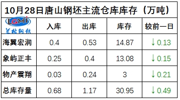 10月28日唐山钢坯库存早报--总量降至30万吨有余