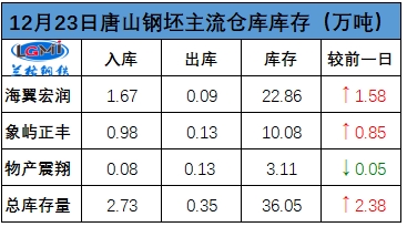 12月23日唐山钢坯库存早报:海翼宏润钢坯库存22.86万吨,较昨日增1.58万吨,入库1.67万吨,出库0.09万吨;象屿正丰钢坯库存10.08万吨,较昨日增0.85万吨,入库0.98万吨,出库0.13万吨;物产震翔钢坯库存3.11万吨,较昨日降0.05万吨,入库0.08万吨,出库0.13万吨;三家仓库总库存量为36.05万吨,较上一日增2.38万吨。