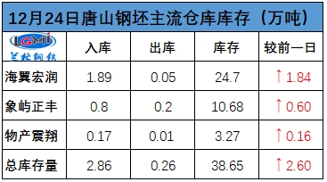 12月24日唐山钢坯库存早报:海翼宏润钢坯库存24.7万吨,较昨日增1.84万吨,入库1.89万吨,出库0.05万吨;象屿正丰钢坯库存10.68万吨,较昨日增0.60万吨,入库0.8万吨,出库0.2万吨;物产震翔钢坯库存3.27万吨,较昨日增0.16万吨,入库0.17万吨,出库0.01万吨;三家仓库总库存量为38.65万吨,较上一日增2.60万吨。