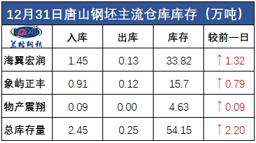 12月31日唐山钢坯库存早报:海翼宏润钢坯库存33.82万吨,较昨日增1.32万吨,入库1.45万吨,出库0.13万吨;象屿正丰钢坯库存15.7万吨,较昨日增0.79万吨,入库0.91万吨,出库0.12万吨;物产震翔钢坯库存4.63万吨,较昨日增0.09万吨,入库0.09万吨,出库0万吨;三家仓库总库存量为54.15万吨,较上一日增2.20万吨。