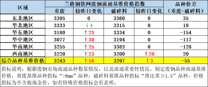 9日兰格钢铁网废钢流通基准价格指数3270涨10:其中重废品种综合基准价格指数为3243涨16,破碎料品种综合基准价格指数为3297涨3。分区域东北地区重废3395(0)破碎料3360(0);华北地区重废3333(↓4)破碎料3315(0);华东地区重废3180(↑23)破碎料3334(0);华中地区重废3077(↑30)破碎料3194(0);华南地区重废3255(↑25)破碎料3383(0);西南地区重废3220(↑23)破碎料3200(↑20)。