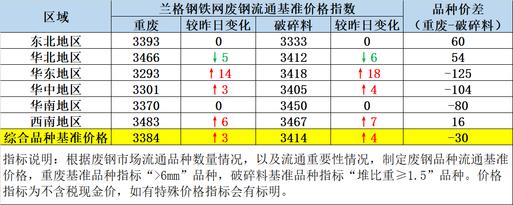 9月27日兰格钢铁网废钢流通基准价格指数3399涨3:其中重废品种综合基准价格指数为3384涨3,破碎料品种综合基准价格指数为3414涨4。分区域东北地区重废3393(0)破碎料3333(0);华北地区重废3466(↓5)破碎料3412(↓6);华东地区重废3293(↑14)破碎料3418(↑18);华中地区重废3301(↑3)破碎料3405(↑4);华南地区重废3370(0)破碎料3450(0);西南地区重废3483(↑6)破碎料3467(↑7)。