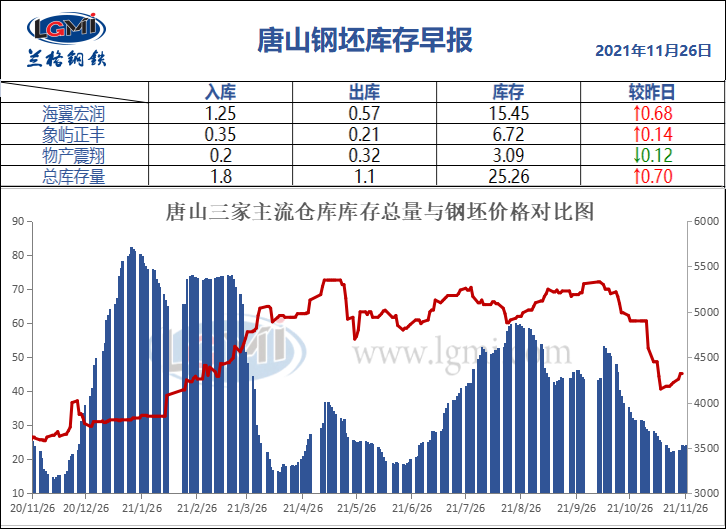今日三家仓库总库存量25.26万吨,较昨日增加0.7万吨。