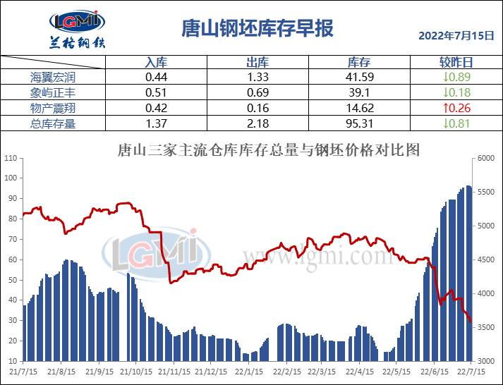 截至今晨8:00唐山丰润三家仓库钢坯库存总量约95.31万吨,单日入库总量1.37万吨,出库总量2.18万吨;库存总量较上月同期增24.42万吨。