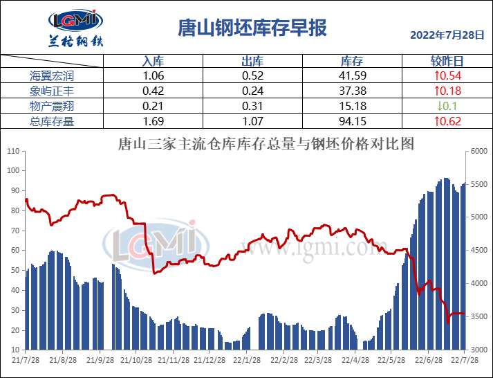 截至今晨8:00唐山丰润三家仓库钢坯库存总量约94.15万吨,单日入库总量1.69万吨,出库总量1.07万吨。