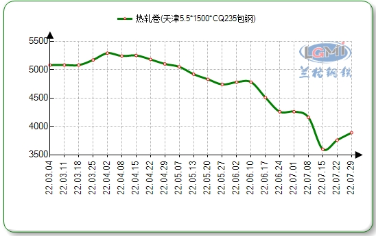 本周华北地区热卷市场涨势拉阔。截至2022年7月29日,天津地区包钢5.5*1500mm普卷3890元,本钢承钢5.5*1500mm普卷3880元,环比上周上涨130元;博兴地区,沧州中铁5.75*1500mm普卷价格较上周涨160元/吨至3970元。