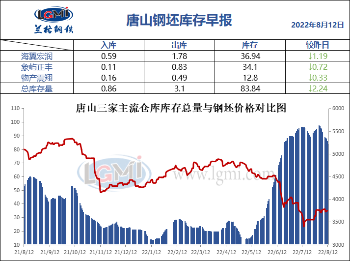 截至今晨8:00唐山丰润三家仓库钢坯库存总量约83.84万吨,单日入库总量0.86万吨,出库总量3.1万吨。