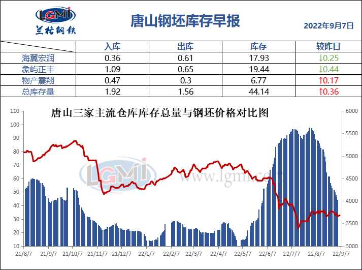 截至今晨8:00唐山丰润三家仓库钢坯库存总量约44.14万吨,单日入库总量1.92万吨,出库总量1.56万吨。