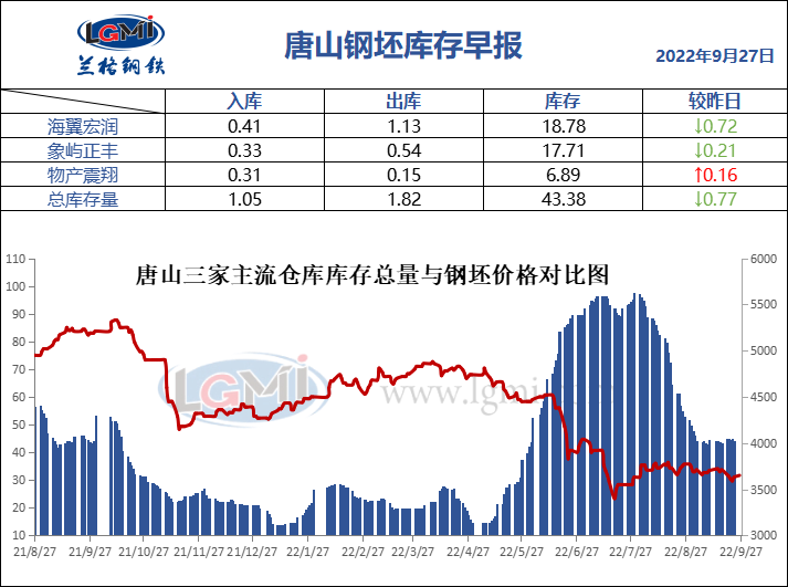 截至今晨8:00唐山丰润三家仓库钢坯库存总量约43.38万吨,单日入库总量1.05万吨,出库总量1.82万吨。