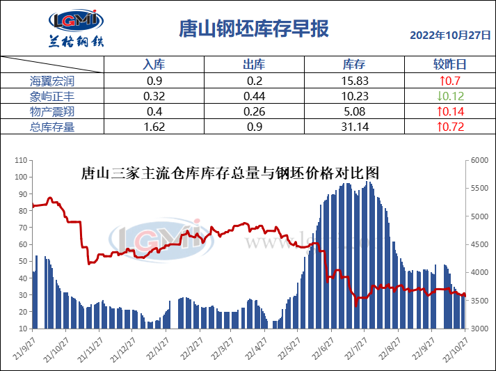 10月27日唐山钢坯库存早报