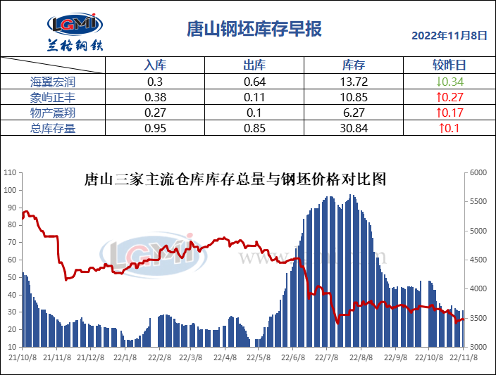 截至今晨8:00唐山丰润三家仓库钢坯库存总量约30.84万吨,单日入库总量0.95万吨,出库总量0.85万吨。