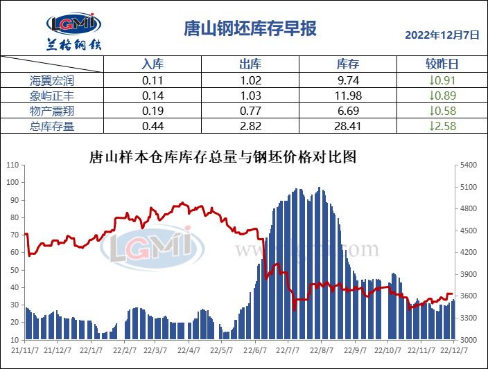 截至今晨8:00唐山丰润三家仓库钢坯库存总量约28.41万吨,单日入库总量0.44万吨,出库总量2.82万吨。