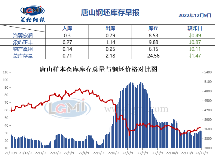 截至今晨8:00唐山丰润三家仓库钢坯库存总量约24.56万吨,单日入库总量0.71万吨,出库总量2.18万吨。