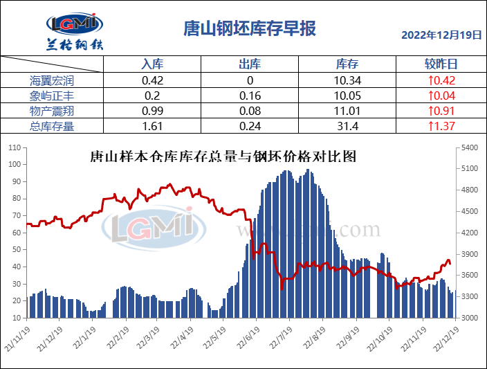 截至今晨8:00唐山丰润三家仓库钢坯库存总量约31.4万吨,单日入库总量1.61万吨,出库总量0.24万吨。