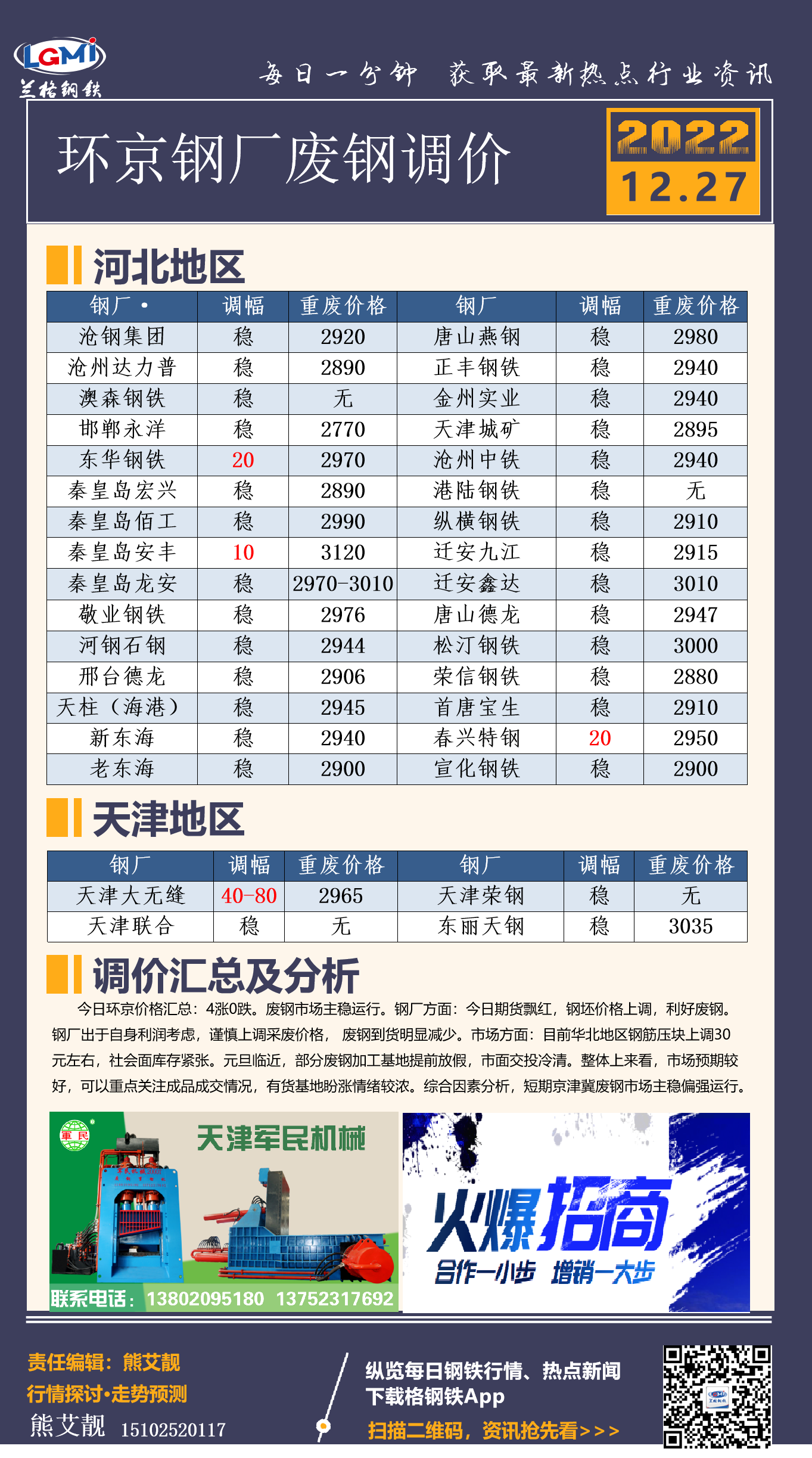 - 12月27日环京钢厂废钢调价汇总2022/12/27