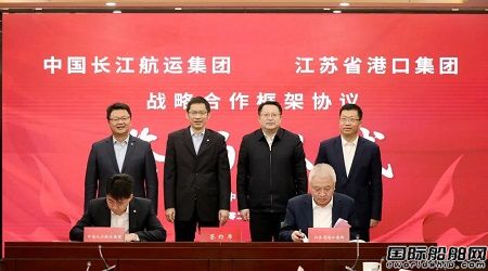 中国长江航运集团党委委员、副总经理李增忠,江苏省港口集团党委委员、副总经理唐洪生代表双方签署战略合作框架协议。中国长江航运集团、江苏省港口集团相关部门、单位负责人参加签约仪式。