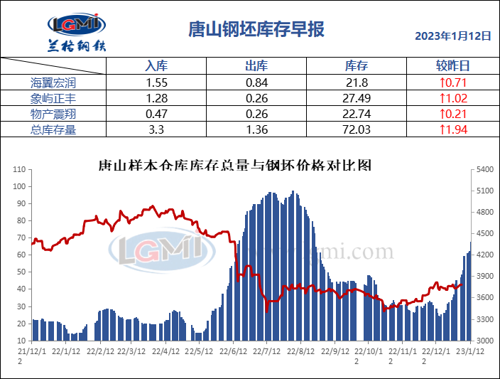 截至今晨8:00唐山丰润三家仓库钢坯库存总量约72.03万吨,单日入库总量3.3万吨,出库总量1.36万吨。