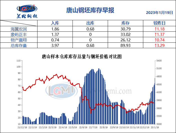 截至今晨8:00唐山丰润三家仓库钢坯库存总量约89.93万吨,单日入库总量3.97万吨,出库总量0.68万吨。
