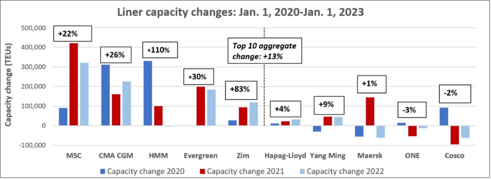 Alphaliner近期发布2022年船队变化概述,排名前10的集运公司总体市场占比保持稳定。在2020年1月1日至2023年1月1日的三年间,这10家船公司总运力增加了260万TEU,涨幅为13%,其船队运力占全球船队85%,而2020年初这一比例为84%。