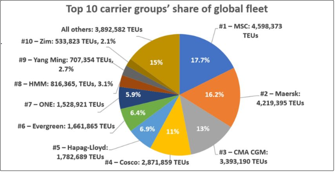 根据Alphaliner的统计,截止今年年初,地中海航运(714艘,总运力460万TEU)、马士基航运(707艘,423万TEU,)、达飞轮船(595艘、340万TEU)、中远海运集团(287万TEU)和赫伯罗特(178万TEU)这五大集运公司总计控制运力1690万TEU,占全球运力64.2%。