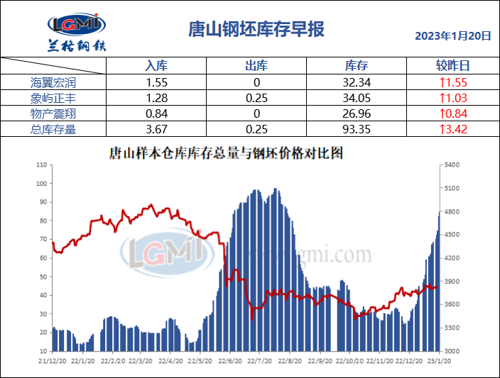 截至今晨8:00唐山丰润三家仓库钢坯库存总量约93.35万吨,单日入库总量3.67万吨,出库总量0.25万吨。