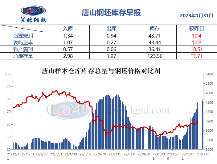 截至今晨8:00唐山丰润三家仓库钢坯库存总量约123.56万吨,单日入库总量2.98万吨,出库总量1.27万吨。
