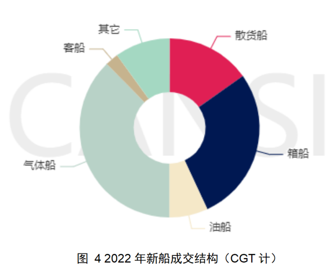 成交船型结构也出现新变化,气体船夺得成交冠军,集装箱船、散货船分列二、三。2022年,气体船成交218艘、1595万CGT,占成交总量的37.7%(CGT计,以下均是);集装箱船成交342艘、1184万CGT,占成交总量的27.9%;散货船成交419艘、643万CGT,占成交总量的15.2%。