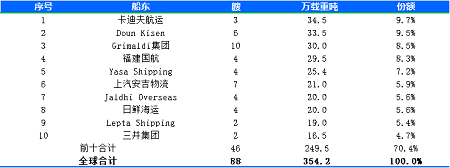 从船东所属国来看,下单最多的国家是日本,共计15艘、94.6万载重吨,全球占比26.7%,但仅有一艘(LPG)在本土船厂建造,其余订单有8艘、52.5万载重吨在中国订造;4艘、20.0万载重吨在韩国订造;2艘、16.5万载重吨在菲律宾订造。第二是希腊,共下单6艘、62.2万载重吨。第三是中国,共下单15艘、51.8万载重吨。从船东订船集中度来看,船东TOP10的合计订造量为46艘、249.5万载重吨,全球占比70.4%。