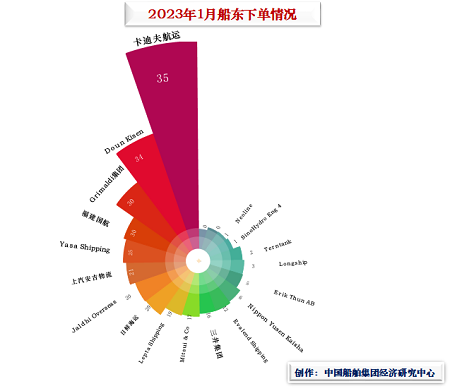 克拉克森数据显示,2023年1月全球共28家船东投资订造新船,累计下单88艘、354.2万载重吨,按载重吨计,同比下降66.9%。下单量前10的船东依次为卡迪夫航运、Doun Kisen、Grimaldi集团、福建国航、Yasa Shipping、上汽安吉物流、Jaldhi Overseas、日鲜海运、Lepta Shipping和三井集团。其中卡迪夫航运订造3艘成品油船,共34.5万载重吨;Doun Kisen订造6艘散货船,共33.5万载重吨;Grimaldi集团订造10艘PCC船,共30万载重吨。