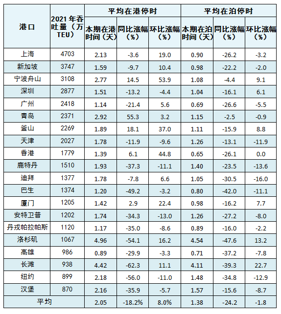 【上海航运交易所发布】2023年1月全球主要港口远洋国际集装箱船舶平均在港在泊停时
