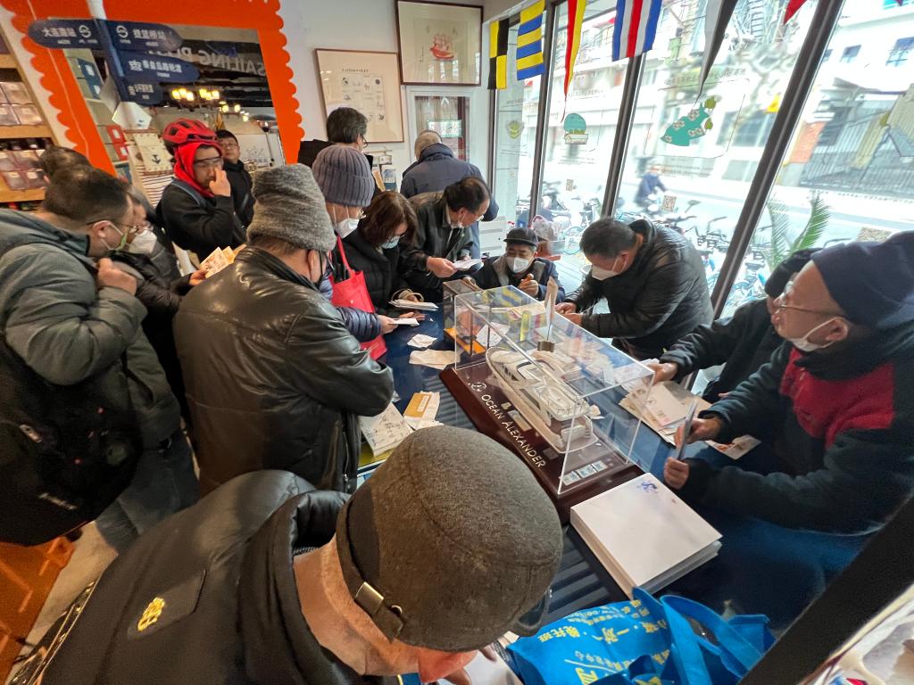 2月21日上午,发布会后,邮迷们在上海航海邮局内选购、寄送,并给邮品加盖中国传统“龙抬头”纪念章。(张闻迪 摄)