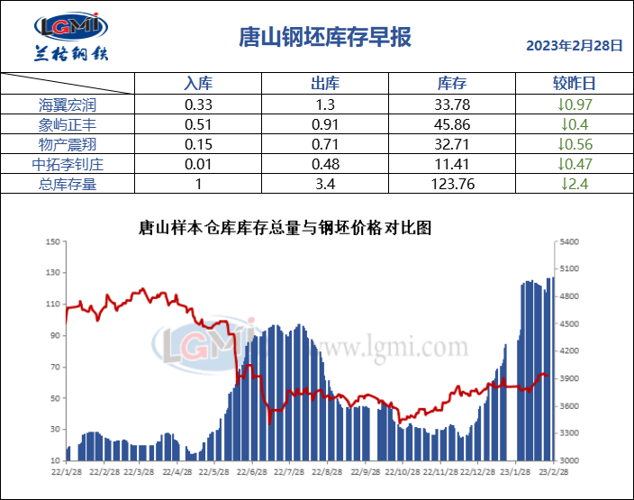 截至今晨8:00唐山地区样本仓库钢坯库存总量约123.76万吨,单日入库总量1万吨,出库总量3.4万吨。(备注:新增样本-中拓李钊庄库)