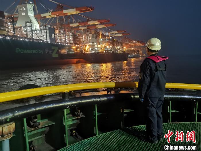据洋山港海事局执法人员介绍,为保障本次加注作业的顺利实施,洋山港海事局在借鉴前期成功加注经验的基础上,参与制定了一系列的作业方案和紧急预案,为该轮的航行、靠泊、作业提供了多重保障。通过船舶交通管理系统和船舶自动识别系统为“海港未来”轮划设“移动安全区”,航行期间其他船舶不得进入该区域;加注船靠泊后,安排执法人员登轮对船员操作技能严格检查确保装卸安全,在两船周围划定“安全作业警戒区”,通过远程监控和交通广播防止过往船舶驶入;同时,组织协调消拖两用拖轮等应急力量现场值守,预防船舶失控、人员受伤等意外情况的发生。