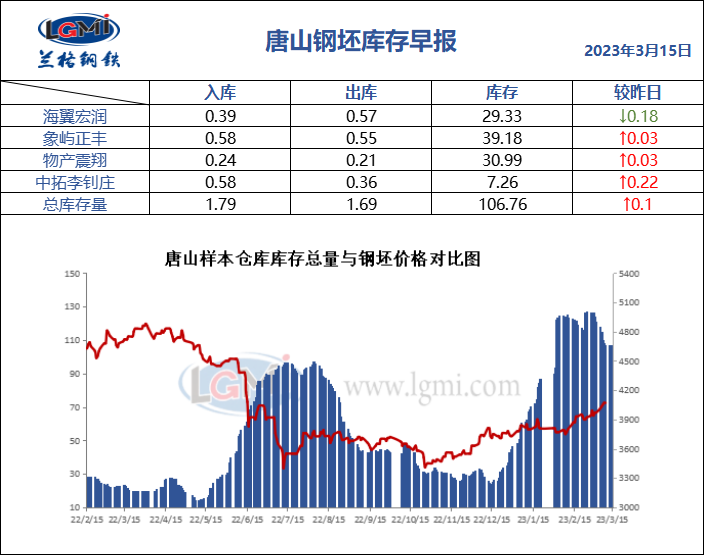 截至今晨8:00唐山地区样本仓库钢坯库存总量约106.76万吨,单日入库总量1.79万吨,出库总量1.69万吨。(备注:新增样本-中拓李钊庄库)
