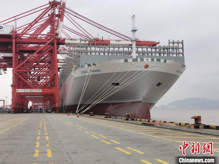 中新网上海3月18日电 (陈静 叶真于)随着中国造船技术发展,靠泊洋山深水港的大型船型单船载箱量不断提升。3月18日上午,单船载箱量达24188标箱的中国香港籍“东方西班牙”号集装箱船缓缓靠泊洋山深水港二期码头,正式开启运营生涯;下午,单船载箱量达24116标箱的利比里亚籍“地中海泰萨”轮靠泊洋山深水港三期码头。