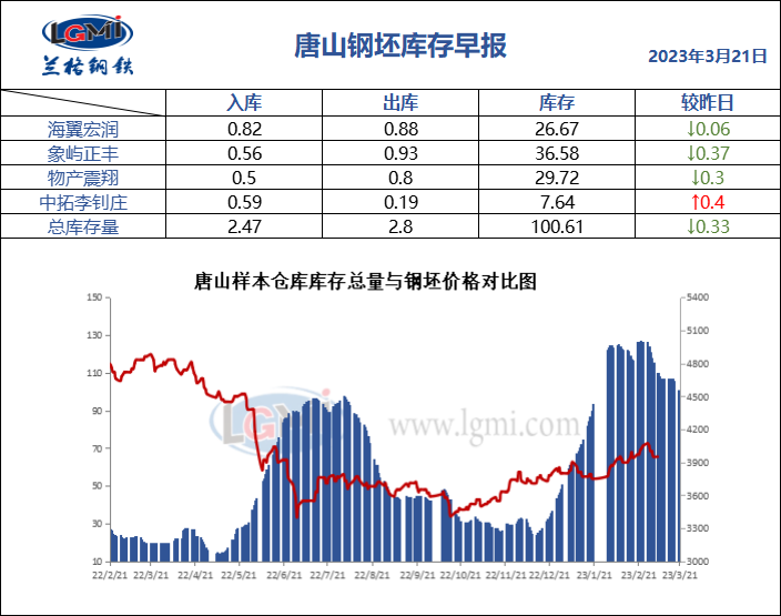 截至今晨8:00唐山地区样本仓库钢坯库存总量约100.61万吨,单日入库总量2.47万吨,出库总量2.8万吨。(备注:新增样本-中拓李钊庄库)