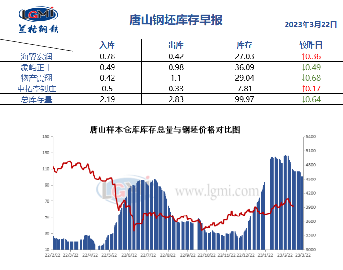 截至今晨8:00唐山地区样本仓库钢坯库存总量约99.97万吨,单日入库总量2.19万吨,出库总量2.83万吨。(备注:新增样本-中拓李钊庄库)